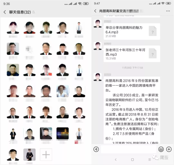 近日,來自安徽群眾的向我們舉報(bào)稱,“有一家公司通過建立群組、開招商會(huì)講課、分享文章等方式進(jìn)行上課,以繳納費(fèi)用能獲得高額的股權(quán)分紅為誘餌,欺騙中老年人,并要求他們發(fā)展會(huì)員?!痹撁e報(bào)者隨后將鷹鑒拉入了一個(gè)叫做“尚朋高科財(cái)富交流群”的群組中。就此鷹鑒展開了一系列的調(diào)查。