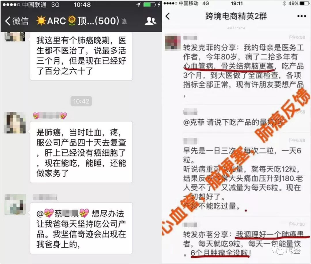 近日,鷹鑒臥底多個(gè)群組,發(fā)現(xiàn)有一家公司代理了一款國外的產(chǎn)品。該組織人員宣稱,“癌癥晚期患者不用吃藥,不用化療,只用吃他們的產(chǎn)品,不到兩個(gè)月就能痊愈。消費(fèi)該公司的產(chǎn)品不僅能包治百病,還能讓人一夜暴富?!柄楄b通過一個(gè)星期的臥底調(diào)查發(fā)現(xiàn),這家公司不僅涉嫌虛假宣傳,還涉嫌傳銷等違法行為。