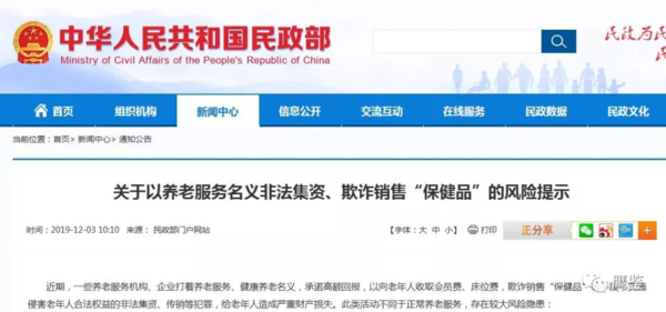 民政部網(wǎng)站截圖 風(fēng)險提示指出,近期,一些養(yǎng)老服務(wù)機構(gòu)、企業(yè)打著養(yǎng)老服務(wù)、健康養(yǎng)老名義,承諾高額回報,以向老年人收取會員費、床位費,欺詐銷售“保健品”等手段,實施侵害老年人合法權(quán)益的非法集資、傳銷等犯罪,給老年人造成嚴(yán)重財產(chǎn)損失。此類活動不同于正常養(yǎng)老服務(wù),存在較大風(fēng)險隱患。 《風(fēng)險提示》指出,以養(yǎng)老服務(wù)名義非法集資、欺詐銷售“保健品”主要有四方面風(fēng)險。 一、高額返利無法實現(xiàn)。返利資金主要來源于老年人繳納的費用,屬于拆東墻補西墻。多數(shù)養(yǎng)老服務(wù)機構(gòu)、企業(yè)不存在與其承諾回報相匹配的正當(dāng)服務(wù)實體和收益,資金運轉(zhuǎn)難以持續(xù)維系,高額返利僅為欺詐噱頭。 二、資金安全無法保障。一些養(yǎng)老服務(wù)機構(gòu)明顯超過床位供給能力承諾服務(wù),或超出可持續(xù)盈利水平承諾還本付息,并以辦理“貴賓卡”、“會員卡”、“預(yù)付卡”等名義,向會員收取高額會員費、保證金或者為會員卡充值,吸收公眾資金。大量來自公眾的資金未實施有效監(jiān)管,由發(fā)起機構(gòu)控制,存在轉(zhuǎn)移資金、卷款跑路的風(fēng)險。 三、健康需求無法滿足。一些企業(yè)通過會議營銷、健康講座、專家義診、免費檢查、免費體驗、贈送禮品或者不合理低價旅游,以及電話推銷、上門推銷、網(wǎng)絡(luò)銷售等形式,向老年人進行虛假或者引人誤解的商業(yè)宣傳,推銷所謂“保健品”。 因“保健品”概念無法律定位,經(jīng)常被采用偷梁換柱、偷換概念的手法,與合法注冊批準(zhǔn)的藥品、醫(yī)療器械、保健食品等進行混同,騙取消費者信任,但所聲稱的保健功能未經(jīng)科學(xué)評價和審批,往往不具備保健功能,甚至貽誤病情。 四、運營模式存在違法風(fēng)險。一些養(yǎng)老服務(wù)機構(gòu)銷售虛構(gòu)的養(yǎng)老公寓、養(yǎng)老山莊,或者以投資、加盟、入股養(yǎng)生養(yǎng)老基地、老年公寓等項目名義,承諾返本銷售、售后包租、約定回購、銷售房產(chǎn)份額等方式吸收資金。 部分企業(yè)不具有銷售商品的真實內(nèi)容或者不以銷售商品為主要目的,而是以免費旅游、贈送實物、養(yǎng)生講座等欺騙、誘導(dǎo)方式,采取商品回購、寄存代售、消費返利等方式非法吸收公眾資金。相關(guān)機構(gòu)及參與人員的上述行為存在非法集資等風(fēng)險。 按照有關(guān)規(guī)定,組織實施非法集資應(yīng)承擔(dān)相應(yīng)責(zé)任,參與非法集資風(fēng)險自擔(dān)。請廣大老年人和家屬提高警惕,增強風(fēng)險防范意識和識別能力,自覺遠離非法集資和傳銷,防止利益受損。如發(fā)現(xiàn)涉嫌違法犯罪線索,可積極向有關(guān)部門舉報。