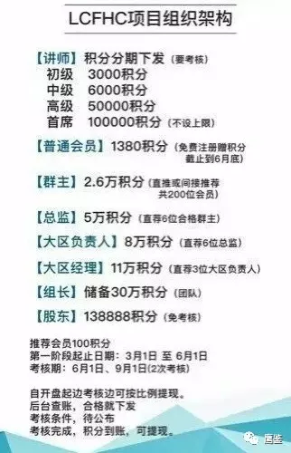 該傳銷團(tuán)伙設(shè)立“LCF項(xiàng)目”傳銷平臺,以“物聯(lián)網(wǎng)數(shù)字貨幣”為噱頭,通過組建微信群,將參加者根據(jù)發(fā)展下線推廣“普惠E卡”手機(jī)卡獲得積分獎勵的多少,組建劃分為股長、組長、大區(qū)(區(qū)域)經(jīng)理、大區(qū)負(fù)責(zé)人、總監(jiān)、群主、講師、普通會員等八個(gè)級別。