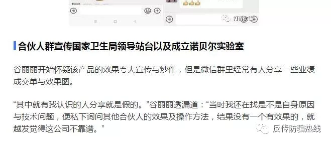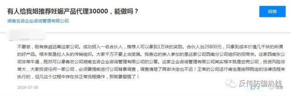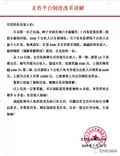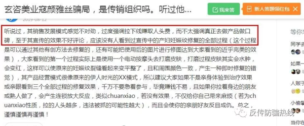 隨著經(jīng)濟(jì)不斷發(fā)展,人們的生活水平不斷提高,對(duì)美的追求也越來(lái)越多,越來(lái)越細(xì)致。從美容美發(fā)到化妝品再到微整容,其中妊娠紋修復(fù)也是一個(gè)例子,以前,這種項(xiàng)目大多出現(xiàn)在美容液、婦產(chǎn)、產(chǎn)康、醫(yī)美等機(jī)構(gòu),現(xiàn)在很多微商類(lèi)型的小群體、小機(jī)構(gòu)也看中了這片藍(lán)海。近期,有一款宣稱(chēng)純植物提取,榮獲美國(guó)FDA認(rèn)證,并且在首次使用該產(chǎn)品妊娠紋修復(fù)度可達(dá)30%-50%,承諾“零創(chuàng)傷、無(wú)痛苦、不反彈、比同類(lèi)產(chǎn)品修復(fù)快3-5倍。45天即可恢復(fù)18歲光滑小腹”的妊娠紋修復(fù)產(chǎn)品引起了李旭反傳銷(xiāo)的注意。來(lái)自西藏王小明(化名)跟李旭反傳銷(xiāo)團(tuán)隊(duì)求助,稱(chēng)他妻子加入了一家名為湖南玄咨企業(yè)管理咨詢(xún)管理有限公司(以下簡(jiǎn)稱(chēng)玄咨公司),一年多時(shí)間,妻子前后投入了90多萬(wàn),現(xiàn)在為了做這個(gè)公司的產(chǎn)品要跟他離婚。同時(shí),王小明投訴說(shuō)這家公司產(chǎn)品夸大宣傳,獎(jiǎng)金制度涉嫌傳銷(xiāo)。去年中旬,查出患有胃癌的王小明妻子麗麗,心情非常不好。麗麗的姐姐為了緩和她的心情,兩姐們相約去旅行散心。在四川玩一趟回來(lái)之后,兩姐妹就說(shuō)加入這個(gè)玄咨公司?!拔耶?dāng)時(shí)也沒(méi)有多想,因?yàn)辂慃惼匠](méi)怎么工作,那時(shí)候覺(jué)得她能找到一份自己喜歡的工作也挺好的”王小明說(shuō)。自此之后,麗麗就把心思全部鋪在這份“事業(yè)”上,她親自去長(zhǎng)沙學(xué)習(xí)了兩個(gè)月時(shí)間,之后就長(zhǎng)期待在四川、重慶等地,也會(huì)到處去聽(tīng)課或者參加各種會(huì)議,而去哪里干什么都不再跟王小明說(shuō)。今年四月,王小明察覺(jué)不對(duì)勁,開(kāi)始停掉麗麗的銀行卡,也不再給她錢(qián)。反復(fù)爭(zhēng)吵急于做出一番事業(yè)的麗麗就跟王小明鬧起了離婚,并說(shuō)要分家產(chǎn)投入進(jìn)去!玄咨公司于2015年成立,企查查資料顯示,2019年6月,玄咨公司因通過(guò)登記的住所或者經(jīng)營(yíng)場(chǎng)所無(wú)法聯(lián)系被長(zhǎng)沙市雨花區(qū)市場(chǎng)監(jiān)督管理局列入經(jīng)營(yíng)異常。李旭反傳銷(xiāo)團(tuán)隊(duì)在企查查上看到,該公司認(rèn)繳出資金額為500萬(wàn)元,其中諶軼昂250萬(wàn)元,諶秀英100萬(wàn)元,諶軼仁100萬(wàn)元,蔣義云50萬(wàn)元,然而實(shí)繳金額都沒(méi)有顯示。值得注意的是,2019年10月,打傳聯(lián)盟曾接到相關(guān)投訴,曝光了玄咨公司遭消費(fèi)者投訴產(chǎn)品夸大宣傳,獎(jiǎng)金制度涉嫌傳銷(xiāo)。近期,玄咨公司又因?yàn)楹贤m紛被人起訴!李旭反傳銷(xiāo)團(tuán)隊(duì)通過(guò)企查查上公布的電話(huà)和官網(wǎng),都無(wú)法跟企業(yè)取得聯(lián)系。其官網(wǎng)顯示404,電話(huà)號(hào)碼一直無(wú)法接通。在百度知道,貼吧等地方,看到很多網(wǎng)友對(duì)玄咨公司的質(zhì)疑。“應(yīng)該有傳銷(xiāo)成份,到處去開(kāi)會(huì)場(chǎng)......”“聽(tīng)說(shuō)過(guò),其銷(xiāo)售發(fā)展模式感覺(jué)不對(duì)勁,過(guò)度強(qiáng)調(diào)拉下線(xiàn)賺取人頭費(fèi)......”“廠(chǎng)家沒(méi)有發(fā)票,產(chǎn)品沒(méi)有效果,拉人的上線(xiàn)提成很高,交了39800元......”等等。
