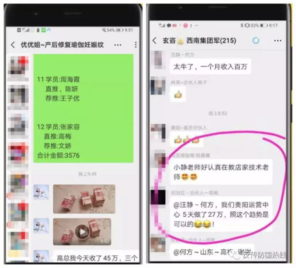 在與該經(jīng)銷(xiāo)商溝通過(guò)程中,她一直跟我們強(qiáng)調(diào),他們做的不是微商而是社群營(yíng)銷(xiāo)。而這所謂的社群營(yíng)銷(xiāo)就是一個(gè)進(jìn)階收費(fèi)的過(guò)程,剛開(kāi)始加入一個(gè)群的時(shí)候,以可以免費(fèi)體驗(yàn)或者免費(fèi)課程之類(lèi)吸引群成員,還時(shí)不時(shí)在群里發(fā)紅包或者假的效果圖讓你心動(dòng)。等你心動(dòng)的時(shí)候就開(kāi)始收錢(qián),剛開(kāi)始不會(huì)收太多,還會(huì)承諾不滿(mǎn)意、無(wú)效果全額退款之類(lèi)的,最后會(huì)告訴你投資多少就可以有更大回報(bào)之類(lèi),設(shè)定會(huì)員等級(jí),一步一步吸引你入坑。