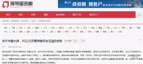 2月26日,有網(wǎng)友在人民網(wǎng)領(lǐng)導(dǎo)留言板給廣東省委書記留言稱,“中國(guó)大獅”、“5G三次方”、“云聯(lián)盟華云數(shù)字”等傳銷平臺(tái)泛濫,并希望政府部門澄清國(guó)家沒有任何平臺(tái)會(huì)以養(yǎng)老金或者項(xiàng)目分紅的形式發(fā)放獎(jiǎng)勵(lì)。