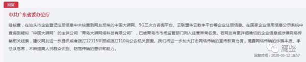 3月12日,中共廣東省委辦公廳回復(fù)該網(wǎng)友的留言稱,經(jīng)核查,在汕頭市企業(yè)登記注冊(cè)信息中未核查到網(wǎng)友反映的“中國(guó)大獅網(wǎng)”、“5G三次方”咨詢平臺(tái)、“云聯(lián)盟華云數(shù)字”平臺(tái)等企業(yè)注冊(cè)信息。