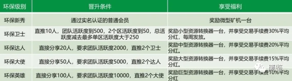 想要成為“環(huán)保新秀”,必須上傳個(gè)人身份證掃描件,并支付2元認(rèn)證費(fèi)完成實(shí)名認(rèn)證即可?!碍h(huán)保新秀”除了能獲得一臺“微型資源轉(zhuǎn)換器”產(chǎn)出垃圾,領(lǐng)取“EP環(huán)保幣”外,還可以通過發(fā)展其他人加入晉升級別,獲得更高級別的資源轉(zhuǎn)換器,以及享受一定比例的交易手續(xù)費(fèi)分紅。交易手續(xù)費(fèi)分紅從30%到10%不等。 除了“微型資源轉(zhuǎn)換器”外,“EP環(huán)境保護(hù)”平臺還設(shè)有小型、中型、大型、巨型、超級、云礦六種類型的“資源轉(zhuǎn)換器”。只要是完成實(shí)名認(rèn)證的會員,均可以通過現(xiàn)金兌換10枚到1萬枚不等的“EP環(huán)保幣”購買不等類型的“資源轉(zhuǎn)換器”。