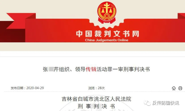 4月29日,吉林省白城市洮北區(qū)人民法院對(duì)外披露了一起涉案金額近億元的特大網(wǎng)絡(luò)傳銷案的判決書。反傳防騙快訊在該判決書上看到,正宇集團(tuán)白城地區(qū)的中心主任張某芹因犯組織、領(lǐng)導(dǎo)傳銷活動(dòng)罪,被判處有期徒刑六年,并處罰金。