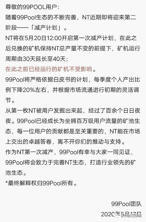 5月17日,涉嫌傳銷的免費挖礦平臺“99礦池”“99Pool”疑似資金鏈斷裂,該平臺的運營團隊發(fā)“99Pool礦池的NT減產(chǎn)公告”稱,NT將在5月20日中午12點開啟第一次減產(chǎn)計劃, 在此之后兌換的礦機保持NT總產(chǎn)量不變的前提下,礦機運行周期由30天延長至40天。并依據(jù)白皮書的計劃,每季度個人產(chǎn)出比例下降20%左右。從該公告中,不難看出這個號稱坐擁百萬級用戶流量的“99Pool”平臺,疑似資金已經(jīng)斷裂,開始降低投資者的回報率和時間。