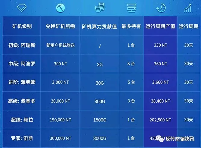 投資者通過推薦人的推薦注冊獲取其網(wǎng)站的注冊賬號,使用該賬號登錄后根據(jù)NT幣的實時價格租賃不同級別礦機進行為期30天的虛擬貨幣投資,期間投資者每日可取得所租礦機“挖礦”所得的固定靜態(tài)收益,從30枚至1.2萬枚。