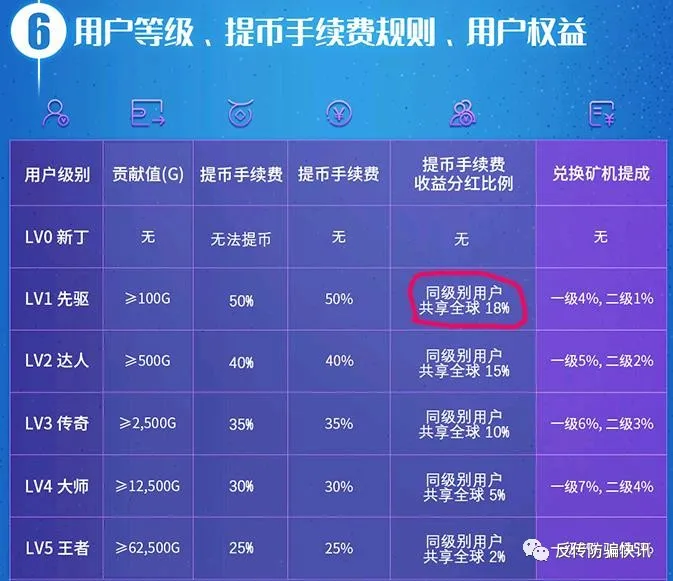 同時,投資者還可以發(fā)展下級投資者,并根據(jù)下級投資者租賃礦機的業(yè)績,即貢獻值,享有手續(xù)費分紅,以及兩代內(nèi)下級投資者兌換礦機時的動態(tài)收益,其收益從1%到18%不等。