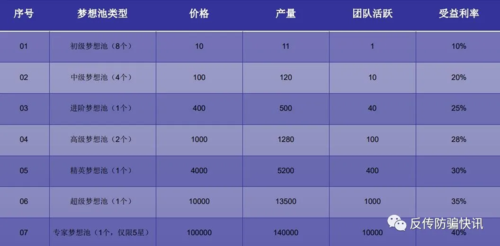 3D智能數(shù)字創(chuàng)業(yè)平臺(tái)的夢(mèng)想池共有初級(jí)、中級(jí)、進(jìn)階、高級(jí)、精英、超級(jí)和專家七個(gè)級(jí)別。參與者需要使用10枚到10萬枚不等的MNW購買,購買以后,在一個(gè)周期內(nèi)可以獲得10%到40%不等的靜態(tài)收益。
