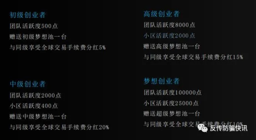 其中,初級(jí)創(chuàng)業(yè)者需要團(tuán)隊(duì)活躍度達(dá)到500點(diǎn),夢(mèng)想創(chuàng)業(yè)者需要團(tuán)隊(duì)活躍度和小區(qū)活躍度,分別需要達(dá)到2000點(diǎn)和400點(diǎn);高級(jí)創(chuàng)業(yè)者的團(tuán)隊(duì)活躍度和小區(qū)活躍度,分別需要達(dá)到8000點(diǎn)和2000點(diǎn);夢(mèng)想創(chuàng)業(yè)者團(tuán)隊(duì)活躍度和小區(qū)活躍度,分別需要達(dá)到10萬點(diǎn)和2.5萬點(diǎn)。