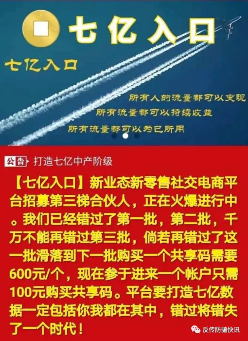“只要交100元注冊會(huì)員,每天賺“流量”,“流量”可變現(xiàn)。介紹10個(gè)會(huì)員,還能獲得股權(quán),三年后公司上市,至少可分到60萬元……”看見這樣的宣傳信息,心動(dòng)嗎?心動(dòng)你就入坑了。
