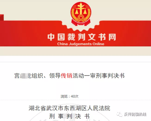 發(fā)表時(shí)間:2020-06-16 20:04作者:反傳防騙熱線來(lái)源:反傳防騙熱線 6月16日,反傳防騙熱線獲悉,武漢市東西湖區(qū)人民法院審理一起“自愿連鎖經(jīng)營(yíng)”傳銷案,宮某龍因組織、領(lǐng)導(dǎo)傳銷活動(dòng)罪,判處有期徒刑一年六個(gè)月,并處罰金人民幣一萬(wàn)元。
