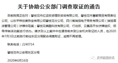 2020年6月16日,攀枝花市公安局東區(qū)分局發(fā)布《關于協(xié)助公安部門門調查取證的通告》,該公告表示,目前該局正在對攀枝花市紅運投資理財咨詢有限公司、攀枝花市慧都商貿有限責任公司、山東芊樺創(chuàng)美珠寶有限公司攀枝花分公司四川省瑞旭電子商務有限公司(瑞旭酒店管理公司)涉嫌非法吸收公眾存款案;攀枝花美酷科技有限公司、行動派、云集品平臺涉嫌組織、領導傳銷活動案進行偵辦。