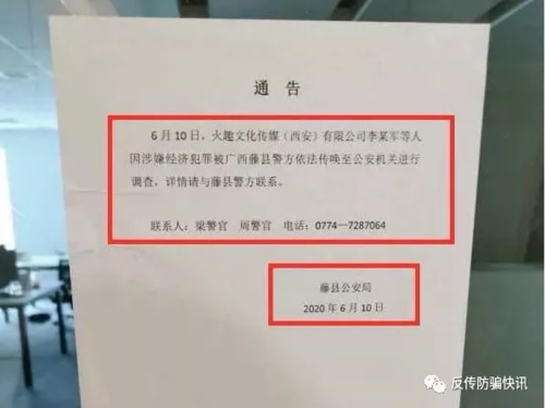 6月10日,藤縣公安局發(fā)布通告表示,火趣西安公司李某軍等人因涉嫌經(jīng)濟(jì)犯罪,被廣西藤縣警方依法傳喚至公安機(jī)關(guān)進(jìn)行調(diào)查。為了證實該消息,小編通過撥打通告上的電話進(jìn)行了確認(rèn)。接電話的民警告訴小編,“火趣”因為涉嫌傳銷已經(jīng)被他們查處。