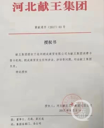 上游新聞?dòng)浾攉@得的一份獻(xiàn)王集團(tuán)的授權(quán)書顯示:獻(xiàn)王集團(tuán)授權(quán)滄州朗成商貿(mào)有限公司為獻(xiàn)王集團(tuán)消費(fèi)卡售卡機(jī)構(gòu),朗成商貿(mào)發(fā)生任何涉法涉訴等問題,均由獻(xiàn)王集團(tuán)負(fù)責(zé)。