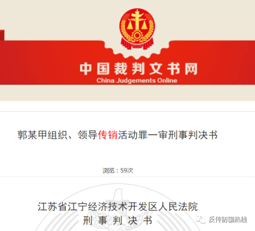 6月21日,反傳防騙熱線獲悉,南京江寧經(jīng)濟(jì)技術(shù)開發(fā)區(qū)人民法院審理一起“連鎖經(jīng)營”傳銷案件,郭某甲犯組織、領(lǐng)導(dǎo)傳銷活動罪,判處有期徒刑一年三個(gè)月,罰金人民幣一萬五千元。