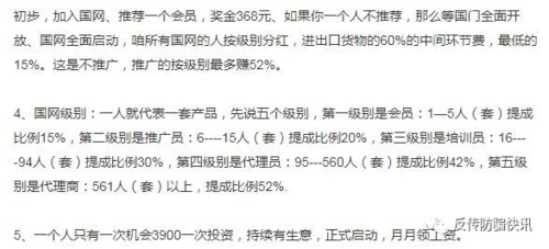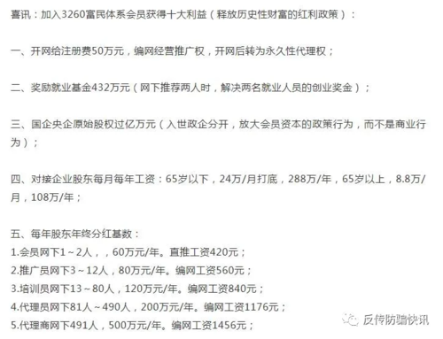 “中國(guó)人際網(wǎng)”和“3260扶貧體系”都是打著國(guó)家暗中扶持的幌子,以推廣“三商法”、“精準(zhǔn)扶貧”、“國(guó)網(wǎng)”項(xiàng)目等為名,以拉人頭加入的形式,分成五個(gè)等級(jí),即繳納3900元3260元成為會(huì)員,會(huì)員發(fā)展2個(gè)以上新會(huì)員成為推廣員,發(fā)展13人以上成為培訓(xùn)員級(jí)別,發(fā)展81人成為代理員級(jí)別,發(fā)展491人成為代理商級(jí)別。同樣鼓吹開(kāi)網(wǎng)后,能獲得幾十萬(wàn)到上億元的高額回報(bào)。