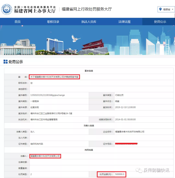 發(fā)表時間:2020-06-21 21:27作者:反傳防騙快訊來源:反傳防騙快訊 近日,福州市臺江區(qū)市場監(jiān)督管理局(以下簡稱:臺江區(qū)市監(jiān)局)對外披露了一起虛假宣傳案的行政處罰書。反傳防騙快訊在該處罰書上看到,福建嘉會泰木科技開發(fā)有限公司(以下簡稱:嘉會泰木公司)因虛假宣傳被處罰50萬元。至案發(fā)時,“泰木谷”共發(fā)展會員133萬余人,經(jīng)營額約為1.95億余元。