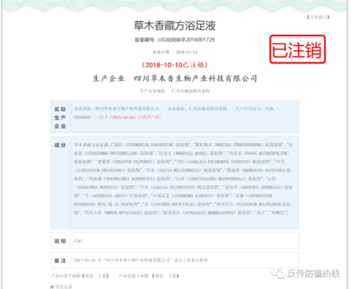 這樣一家“劣跡斑斑”的公司,正常早應該已經關停了,而據投訴人麗麗(化名)稱,疫情期間因為不能開會,領導人成立臨時群在群里宣傳開單,疫情一過就立馬在各地組織線下會議宣傳。參與者基本為一些中老年群體。 麗麗表示,她于2016年接觸到這個平臺,剛開始是因為健康的原因,有人給她推薦產品,抱著試一試的心態(tài),沒有多加猶豫就加入了。慢慢地,上線就不再讓她推銷產品,開始誘導讓她帶人去學習了解,讓帶去的人交錢一起做。麗麗稱,她自己前后分多次投入五萬多,幾年下來,沒賺到錢不說,還搭進去不少培訓費,餐費。今年,她發(fā)現年會時候有的老師的領獎、領車都是假的,只是為了刺激更多人的賺錢夢而已。不僅如此,麗麗說產品用了多年也沒有什么效果,這才算是徹底的醒悟過來。 據藏生堂某市場推廣人員介紹,藏方浴足液是他們的主打產品,只要使用三個療程就可以輕松告別亞健康,解決痛經、失眠、腳氣、內分泌失調、灰指甲、三高等問題?!爸灰先藖砼菀淮文_,肯定立馬購買”這位市場推廣人員熱情地說到。 該產品包裝上顯示,許可證編號:川妝20160035,監(jiān)制單位:哈吉動力科技股份有限公司,出品單位:四川草木香生物產業(yè)科技有限公司,條碼:6971283510026。李旭反傳銷團隊查詢到四川草木香生物產業(yè)科技有限公司“草木香藏方浴足液(川G妝網備字2016001729)”曾是經國家藥品監(jiān)督管理局備案生產的非特殊用途化妝品,不是藥品,沒有治療功效,且該產品備案信息已于2018-10-10已注銷,而“藏生堂”可能是該產品在包裝盒上使用的商標。