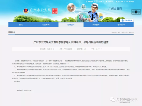 6月22日,廣州市公安局通過(guò)其官方網(wǎng)站對(duì)關(guān)于查處李振家等人涉嫌組織、領(lǐng)導(dǎo)傳銷(xiāo)活動(dòng)案進(jìn)行了通告。該通告顯示,刷臉智付(廣東)科技股份有限公司(以下簡(jiǎn)稱:刷臉智付公司)的經(jīng)營(yíng)模式涉嫌傳銷(xiāo)犯罪,我局已對(duì)該公司的負(fù)責(zé)人李振家等人涉嫌組織、領(lǐng)導(dǎo)傳銷(xiāo)活動(dòng)進(jìn)行查處。