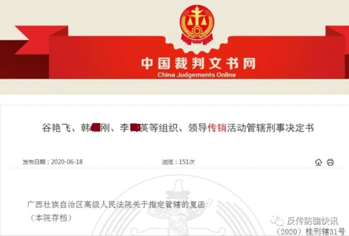 目前,廣西高院已經(jīng)指定岑溪市人民法院審理林國(guó)強(qiáng)、谷艷飛、韓某剛、李某英、張某臻、曹某、吳某軍、楊某森、馮某堯、李某峰、張某英、劉某東、李某芹涉嫌犯組織、領(lǐng)導(dǎo)傳銷活動(dòng)罪一案。關(guān)于“中金銀?!碧卮髠麂N案反傳防騙快訊也會(huì)持續(xù)關(guān)注。[此文來源反傳防騙快訊,版權(quán)歸原作者,如侵權(quán),請(qǐng)聯(lián)系刪除]