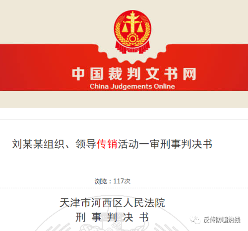 6月29日,李旭反傳銷團(tuán)隊(duì)獲悉,天津市河西區(qū)人民法院審理一起傳銷案件,劉某某犯組織、領(lǐng)導(dǎo)傳銷活動(dòng)罪,判處有期徒刑一年,緩刑一年,并處罰金人民幣二萬元;在案追繳違法所得人民幣一萬元依法沒收,上繳國(guó)庫。