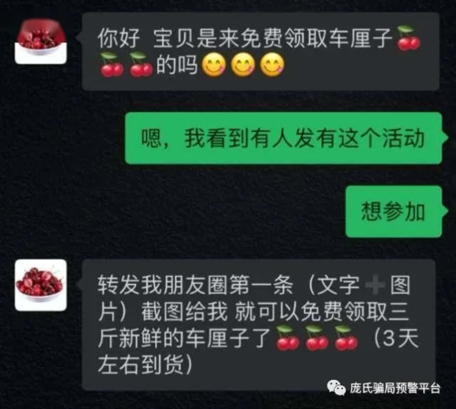 今年4月,李女士在微信朋友圈看到了免費領(lǐng)車厘子的廣告,便掃描二維碼添加對方為好友。之后,對方把李女士拉到一個微信聊天群中,群里的人都在聊免費領(lǐng)取車厘子的事情,也有人討論賺錢的好方法,管理員“熱心地”在群里發(fā)布了一些賺錢的信息。