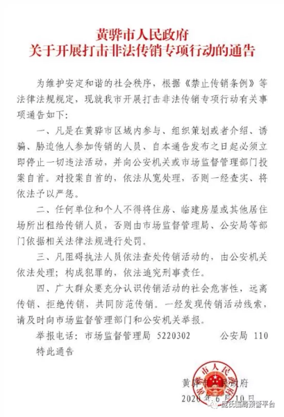 6月30日,中共黃驊市委宣傳部通過其官方公眾號(hào)“網(wǎng)信黃驊”發(fā)布了一份最嚴(yán)開展打擊非法傳銷專項(xiàng)行動(dòng)的通告。該通告要求凡是在黃驊市區(qū)域內(nèi)參與、組織策劃或者介紹、誘騙、脅迫他人參加傳銷的人員、自本通告發(fā)布之日起必須立即停止一切違法活動(dòng),并向公安機(jī)關(guān)或市場監(jiān)督管理部門投案自首。對(duì)投案自首的,否則將依法一律予以嚴(yán)懲。以下是公告全文: