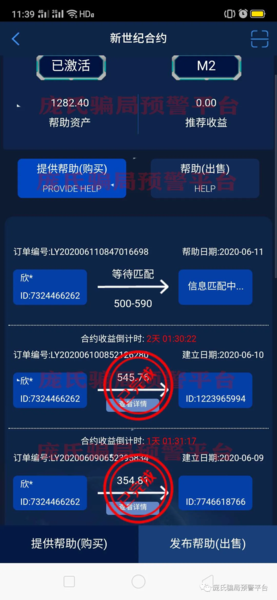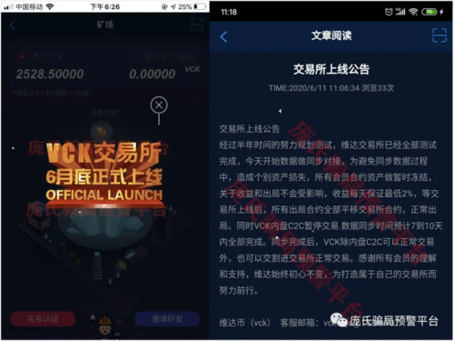 來(lái)自山東煙臺(tái)的宋女士告訴小編,“今年5月份朋友向我推薦了一個(gè)‘維達(dá)合約’項(xiàng)目,朋友說(shuō)這個(gè)平臺(tái)掙錢特別快,只需要在火幣網(wǎng)注冊(cè)賬戶,購(gòu)買USDT(泰達(dá)幣)轉(zhuǎn)入維達(dá)幣平臺(tái)提供的火幣網(wǎng)錢包里面,就可以像銀行存錢一樣,每天賺2%的利息。” 宋女士說(shuō),“維達(dá)合約”項(xiàng)目是一個(gè)互助搶單模式。投資者轉(zhuǎn)入7枚到1000枚不等泰達(dá)幣就可以搶單“發(fā)布幫助”(出售泰達(dá)幣),等其他投資者“提供幫助”(購(gòu)買泰達(dá)幣)成功后,每單就可以賺到2%的利息。 在朋友的忽悠下,宋女士于是在5月30日注冊(cè)了火幣網(wǎng)和維達(dá)幣平臺(tái)賬戶,并通過(guò)火幣網(wǎng)購(gòu)買了200多枚的泰達(dá)幣,開始玩起了“新世紀(jì)合約”項(xiàng)目。宋女士在嘗到甜頭以后,開始加大投資,先后分四次共投進(jìn)去了1.16萬(wàn)元。 6月11日,維達(dá)幣平臺(tái)發(fā)布“交易所上線公告”稱,維達(dá)交易所已經(jīng)全部測(cè)試 完成,為避免同步數(shù)據(jù)過(guò)程中,造成個(gè)別資產(chǎn)損失,所有會(huì)員合約資產(chǎn)做暫時(shí)凍結(jié),同時(shí)VCK(維達(dá)幣)內(nèi)盤C2C暫停交易。7到10天交易所上線后,所有合約平移到交易所,內(nèi)盤C2C可以正常交易。