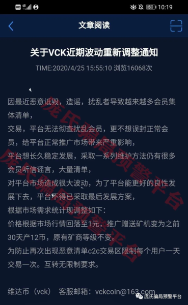 受害者供圖 和宋女士遭遇一樣的還有吳女士。吳女士說(shuō),她是從3月18日通過(guò)朋友接觸到的維達(dá)幣。朋友說(shuō)維達(dá)幣每天都在上漲,現(xiàn)在都漲到了10元1枚,并與比特幣等虛擬貨幣做對(duì)比。 吳女士當(dāng)時(shí)擔(dān)心被騙,就抱著質(zhì)疑的態(tài)度觀望了一個(gè)多月。但最后吳女士還是沒有經(jīng)住對(duì)方的誘惑,還是投資購(gòu)買了維達(dá)幣。令吳女士沒有想到的是,在其剛加入的第二天下午,維達(dá)幣直接從10.25元暴跌到近1元。 4月25日,維達(dá)幣平臺(tái)將這個(gè)“鍋”甩給了“擾亂者”。該平臺(tái)發(fā)公告稱,是因?yàn)樽罱袛_亂者惡意詆毀、造謠,導(dǎo)致越來(lái)越多的會(huì)員集體清單交易才造成暴跌的。