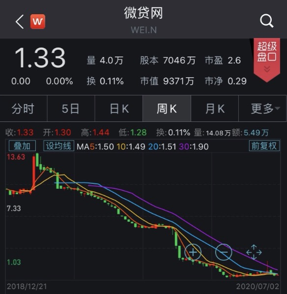截至7月3日(周五)收盤,微貸網(wǎng)市值9371億美元,股價僅剩下1.33美元/股,距最高點已經(jīng)跌去超90%。