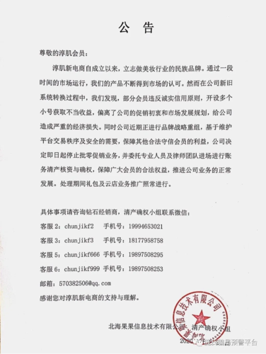 6月24日,淳肌新電商運營方北海果果信息技術有限公司在平臺發(fā)布公告稱,在公司新舊系統(tǒng)轉換過程中,公司發(fā)現(xiàn)部分會員違反誠實信用原則,開設多個小號獲取不正當收益,偏離了公司的促銷初衷和市場發(fā)展規(guī)劃,給公司造成嚴重的經(jīng)濟損失。同時公司近期正進行品牌戰(zhàn)略重組,基于維護平臺交易秩序及安全的需要,保障其他合法守信會員的利益,公司決定即日起停止批零促銷業(yè)務,并委托專業(yè)人員及律師團隊進場進行賬務清產(chǎn)核資與確權。