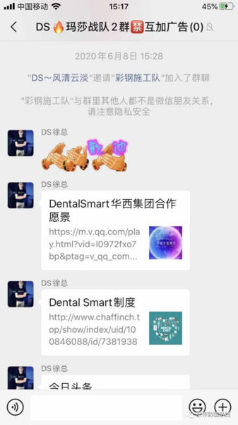 發(fā)表時間:2020-07-07 20:39作者:李旭反傳銷團(tuán)隊來源:李旭反傳銷團(tuán)隊 不知道在什么時候,網(wǎng)絡(luò)上流傳著這么一句話:人無股權(quán)不富? 近日網(wǎng)友王先生跟李旭反傳銷團(tuán)隊曝料,他于5月10日開始接觸互聯(lián)網(wǎng)項目,本想著賺點生活費,卻不曾想成為新一批“韭菜”被人收割。 據(jù)王先生講,他是通過微信群了解到Dental Smart牙科股權(quán)分紅項目,以入股的形式拿分紅,2個多月就能回本。剛接觸互聯(lián)網(wǎng)項目本著謹(jǐn)慎小心的心態(tài),他在網(wǎng)上查了很多資料。