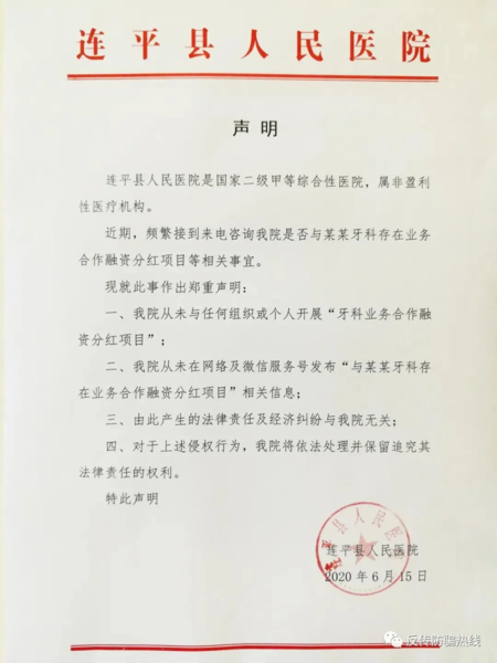 投下的那段時光無不每天都提心吊膽的過日子,畢竟是自己幾年的血汗錢,最終還是難逃厄運,就在6月15日準(zhǔn)備提現(xiàn)的時候平臺關(guān)網(wǎng)了跑路了,各大網(wǎng)站都登不進(jìn)去了,已知的20余個DS項目群都被解散,群里面的負(fù)責(zé)人也都紛紛跑路。 事發(fā)當(dāng)天,合作方連平縣人民醫(yī)院公眾號也在當(dāng)天發(fā)表聲明說未與任何牙科項目有過合作。