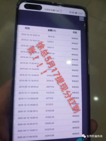 被踢出群后的王先生徹底慌了神,頓時心跳加速,胸口悶痛,呼吸困難那種窒息感,那種絕望無能為力的感覺無法形容。冷靜下來的王先生與介紹他的人聯(lián)系,能聯(lián)系到的,我們已經(jīng)建立了幾個商討群,考慮如何挽回?fù)p失,全國各地的已知的受害者有兩千余人,在各地已經(jīng)報案。 跟王先生類似的幾位群友損失情況: L先生:2月26日投21000,5月6日投63000。 小蘭:一月份開始投的,投了一個70,二月份投了個700,見能提現(xiàn)而且提現(xiàn)準(zhǔn)時,就被他們蒙騙了,四月份投了十多萬進(jìn)去,五月提現(xiàn)后又投了幾萬。總共投資十七萬。 小羅,四川人,2020四月份分別第一次投70,第二次投700,第三次投7000,接下來四個7000 據(jù)王先生講,他們加入其中,是因為他們的登陸網(wǎng)址都是國內(nèi)正規(guī)公司的官網(wǎng);其次是投資早的人,以試一試的態(tài)度,第一個月投入,第二個月能及時提現(xiàn);第三點是宣傳資料中提到的保本機(jī)制。 王先生希望通過自己血淋漓的教訓(xùn),提醒大家不要在盲目的相信互聯(lián)網(wǎng)中的投資項目。 |