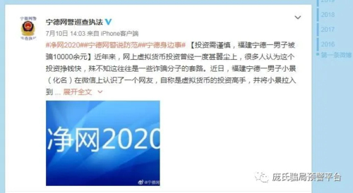 近年來,網(wǎng)上虛擬貨幣投資曾經(jīng)一度甚囂塵上,很多人認(rèn)為這個(gè)投資掙錢快,殊不知這往往是一些詐騙分子的套路。7月10日,“寧德網(wǎng)警巡查執(zhí)法”賬號在新浪微博、微信公眾號、今日頭條和百度百家號等平臺(tái),發(fā)布近期發(fā)生在我市的一起投資詐騙案件。