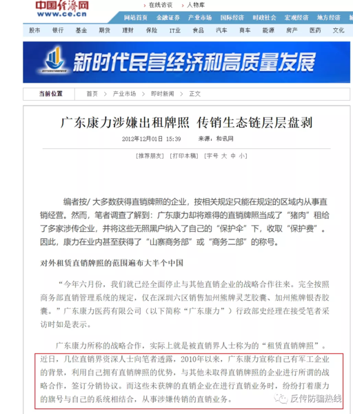 以上述模式,“康某樂信”傳銷組織僅在2012年3月至2012年9月份期間,注冊會(huì)員注冊費(fèi)用達(dá)人民幣2.03億余元,返給會(huì)員人民幣0.79億余元,被告人胡某和徐某、謝某等“股東”成員非法獲利人民幣1.24億余元。 李旭反傳銷團(tuán)隊(duì)了解到,上述提到的“康某”就是廣州康力醫(yī)藥有限公司,李旭老師回憶稱,2012年廣東康力涉嫌向傳銷公司出租牌照,有幾家媒體的記者就此事采訪過他,日前,我們還能在百度上搜索到相關(guān)新聞。
