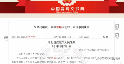 ▲胡某組織、領(lǐng)導(dǎo)傳銷活動(dòng)一審刑事判決