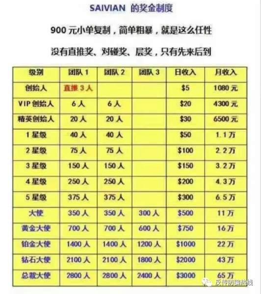 此外,每個會員固定發(fā)展3個下級,三個下級分為兩組,其中一組一人,另外一組兩人,下級的三人也是以同樣的方式和模式來發(fā)展下級,以此類推,每個人名下的兩組人發(fā)展的人數(shù)取兩組人數(shù)中少的那組的人數(shù)來評級,對應的等級越高,每日獲得的返利(以美元打入其在賽比安的賬號)越多,如發(fā)展3個下線,就可以獲得5美元/天,發(fā)展12個下線,可以拿到20美元/天,以此類推。