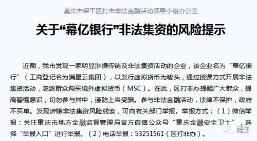 7月29日,重慶市梁平區(qū)打擊非法金融活動(dòng)領(lǐng)導(dǎo)小組辦公室通過梁平日報(bào)發(fā)布《關(guān)于“幕億銀行”非法集資的風(fēng)險(xiǎn)提示》。該風(fēng)險(xiǎn)提示表示,近期,我市發(fā)現(xiàn)一家明顯涉嫌傳銷及非法集資活動(dòng)的企業(yè),該企業(yè)名為“幕億銀行”(工商登記名為滿星云集團(tuán)),以發(fā)行虛擬貨幣為噱頭,通過授課方式開展非法集資活動(dòng),忽悠群眾購買境外虛擬貨幣(MSC)。