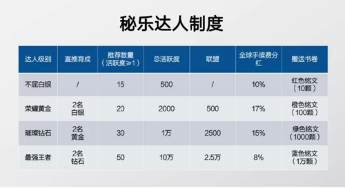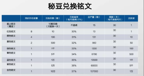 1、靜態(tài):注冊實名認證贈送15顆秘豆銘文礦機,刷5分鐘小視頻,32天產15顆秘豆,夠10顆兌換紅色銘文提高產量,月入幾百元 2、推廣1位有效會員,拿5%活躍度,獎勵0.5顆秘豆,擁有直推會員復投兌換銘文5%獎勵!推得多收益就越多 3、推廣15人,團隊活躍度500,贈送一張13顆秘豆紅色銘文,享受全網置換手續(xù)費10%分紅!月入5000元左右 …… 6、推廣50人,團隊活躍度10萬,贈送一臺13500枚藍色銘文,享受全網置換手續(xù)費8%分紅,月入30萬元左右