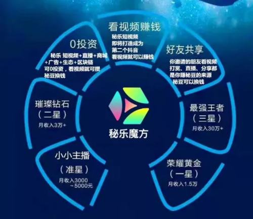 近日,當華燈初放時,在羅平縣南片區(qū)、萬元街等人員密集區(qū)域,總有人拿著星光閃爍的氣球等物品,吆喝著,掃碼就可以免費領取一個氣球,你只要打開微信掃一掃對方提供的二維碼,就可以領取一個氣球。小編試著掃了一下,發(fā)現是一個叫秘樂短視頻的App!網上一查,令人大吃一驚,大家可以看看。 近兩年來,區(qū)塊鏈概念火熱無比,引得無數投機者趨之若鶩。但由于其專業(yè)性過強,導致很多人一知半解,甚至全然不清楚只知道追逐。 于是,伴著這股追鏈潮,市場上也出現了各種打著區(qū)塊鏈概念實施詐騙的現象。今天小編要和大家分析的這個資金盤,也是之前比較火的一個項目——秘樂短視頻。 秘樂短視頻——看視頻賺錢? 據了解,秘樂短視頻是由浙江秘樂魔方網絡科技有限公司推出來的一款“看視頻賺錢”軟件。該公司是在2019年11月28日成立的。 和之前“趣步”“火?!钡葌麂N資金盤相比,秘樂短視頻甚至是有過之而無不及,該軟件號稱是:0投資、0門檻、0風險,光看視頻就能月賺3000-300000人民幣。 靜態(tài)收益+動態(tài)收益=騙人無數 在該平臺的宣傳資料上,我們可以看見秘樂短視頻所謂的拉人頭計劃,野心昭然若揭!