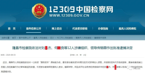 8月3日,四川省隆昌市人民檢察院對(duì)外披露了一起以投資“原始股”為名義的特大傳銷案件最新進(jìn)展。劉某杰、何某良等12人因涉嫌組織、領(lǐng)導(dǎo)傳銷罪被該院作出批準(zhǔn)逮捕的決定。