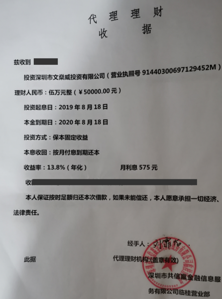 發(fā)表時間:2020-08-06 10:23作者:國華財經來源:國華財經 國華財經7月22日報道 近日,有投資人向國華財經爆料稱,深圳市文燊威投資有限公司利用旗下深圳市共信贏金融信息服務有限公司進行吸納資金,目前甚至已到無法兌付局面,國華財經就此展開調查。 據調查,深圳市文燊威投資有限公司主要利用深圳市共信贏金融信息服務有限公司在各地開展業(yè)務。該公司開展業(yè)務模式非常簡單,投資即可保本保息獲得本息,按月付息到期返本,例如投資5萬元,年化收益率13.8%,月利息535元。國華財經發(fā)現(xiàn),深圳市文燊威投資有限公司和深圳市共信贏金融信息服務有限公司目前都未獲得金融牌照,在未獲得金融主管部門批準的情況下,面向不定向公眾吸納資金,并在一定時期內給付回報,已經涉嫌非法集資。 目前,該公司更利用疫情為由,直接表示無法對付本金,造成一定社會恐慌。為了安撫投資人,深圳市文燊威投資有限公司單方面宣布以深圳市文燊威大廈、哈爾濱香港中心、深圳龍崗老墟改造項目未來收益進行履約,但投資人對此疑惑重重,“感覺是在拖時間,項目并不可靠?!眹A財經將持續(xù)關注后續(xù)情況,并向當?shù)貓?zhí)法部門反饋深圳市文燊威投資有限公司涉嫌非法集資一事。 |