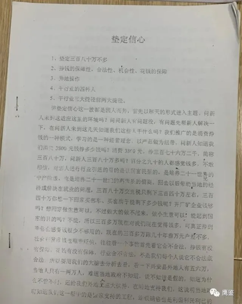 據(jù)調(diào)查了解,該團(tuán)伙以“深圳文斌貿(mào)易有限公司”為名,通過蠱惑、拉攏新人加入,誘騙新人繳納入門費(fèi)、會員費(fèi)等為名的申購款。之后不斷唆使新人發(fā)展其他人加入,從而不斷瓜分申購款,以達(dá)到獲得暴利的目的。