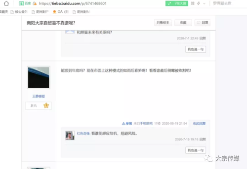 關(guān)于南陽(yáng)大宗涉嫌傳銷,不只李旭有此擔(dān)憂。期貨日?qǐng)?bào)記者通過(guò)期報(bào)輿情監(jiān)測(cè)系統(tǒng)發(fā)現(xiàn),在南陽(yáng)市人民政府官網(wǎng)的問(wèn)政回應(yīng)一欄,不少網(wǎng)友詢問(wèn)南陽(yáng)大宗存在哪些風(fēng)險(xiǎn),是否有保障,是不是資金盤等問(wèn)題;在百度貼吧關(guān)于“南陽(yáng)大宗靠不靠譜”一帖中,有網(wǎng)友則直接表示,現(xiàn)在市面上這種模式層出不窮,看看誰(shuí)最后倒霉被收割吧。